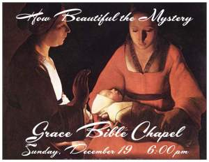 Grace Bible Chapel of York Springs will be holding a special cantata by the title “How Beautiful the Mystery” (based on 1 Timothy 3.16) on Sunday, December 19 at 6:00 p.m. The program is a short cantata on the theme of the incarnation of Christ. Following the cantata will be the candlelight portion of the service.