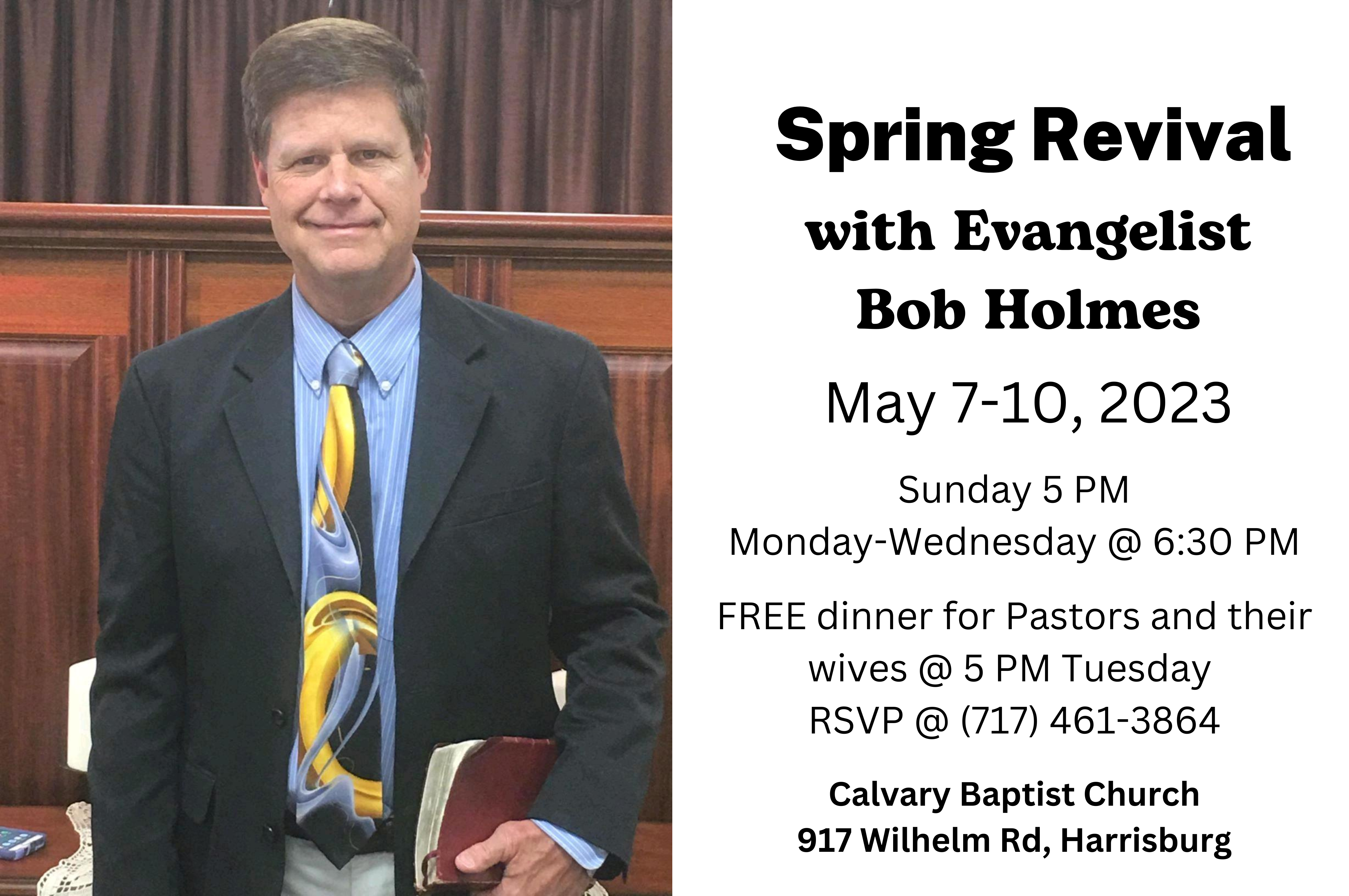 We greatly appreciate your interest and support of the Harrisburg Area Preachers’ Fellowship. Please find attached a list of upcoming Pastor Fellowship meetings for 2023-24. If you have any upcoming meetings you would like to announce, including flyers or pictures, please contact Perry Kile, Pastor, Bible Baptist Church, New Bloomfield, 717- 582-8365, bbc.1757.nb@gmail.com or Wes Gunther, Pastor, Cedar Hill Baptist Church, Dillsburg, 717-652-8243, cedarhillbap@gmail.com.