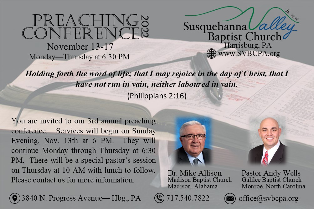 We are back! On Tuesday, February 21 we will hold a Pastor’s fellowship at the Cedar Hill Baptist Church of Dillsburg. We will have some breakfast refreshments and coffee available at 9:30 AM. We will have a message from God’s Word at 10:00 AM (speaker yet to be determined). At 11:00 AM I would like to have an open forum for discussion. Topics to include but not limited to: